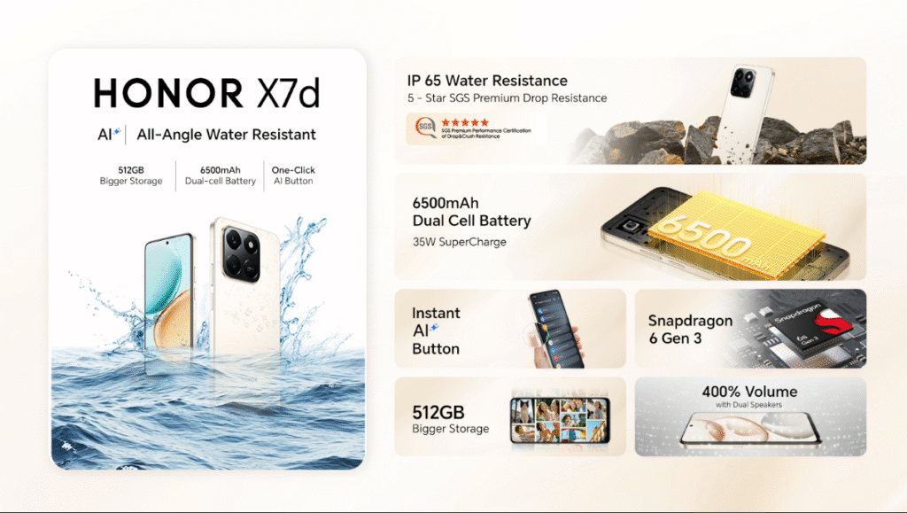“The HONOR X7d represents HONOR’s dedication to providing practical, feature-rich smartphones catering to the needs of budget-conscious consumers who still desire AI interaction in their mobile devices. Setting a benchmark as a powerful budget phone with enhanced durability and brand-new AI experience in the market, the HONOR X7d brings 5-star Premium Drop Protection, IP65 Water Resistance, a robust 6500mAh Dual-cell Battery, 108MP Ultra-Clear Main Camera and stunning Instant AI Button,” said HONOR Philippines Vice President Stephen Cheng.