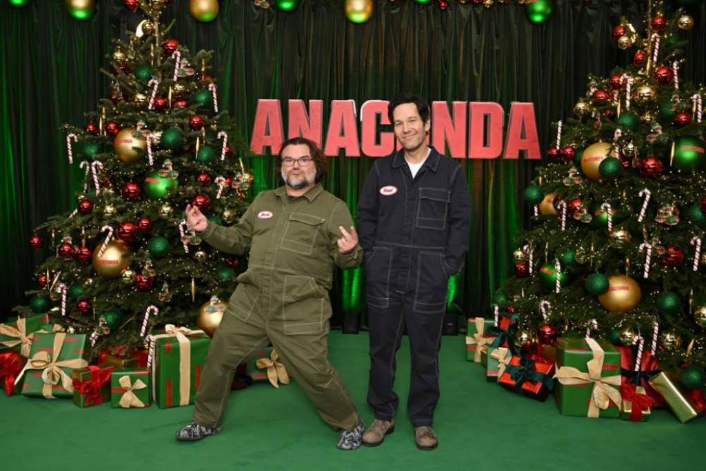 Paul Rudd (L) and Jack Black strike a pose together at the World Premiere of Columbia Pictures’ ANACONDA at the United Theater on Broadway on December 13, 2025 in Los Angeles, California.