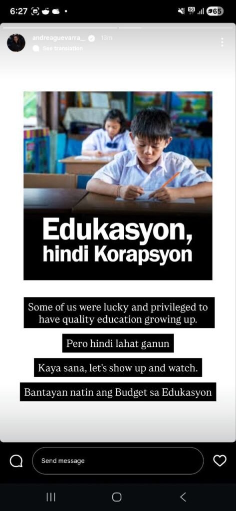 Andrea called on her family, friends, and followers to monitor the bicam’s livestream, saying it is an opportunity for them to ensure the education budget remains intact.
