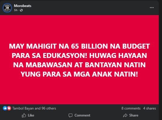 “May mahigit na 65 billion na budget para sa edukasyon! Huwag hayaan na mabawasan at bantayan natin yung para sa mga anak natin!” it said.