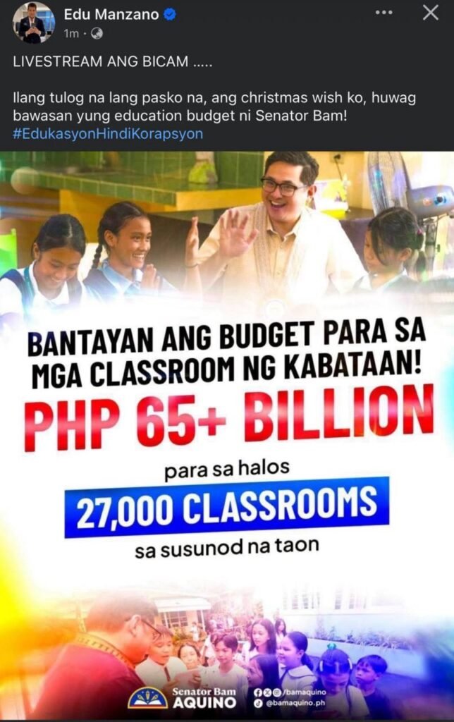 “LIVESTREAM ANG BICAM. Ilang tulog na lang bago Pasko, ang Christmas wish ko: huwag bawasan yung education budget ni Senator Bam! #EdukasyonHindiKorapsyon,” he posted.