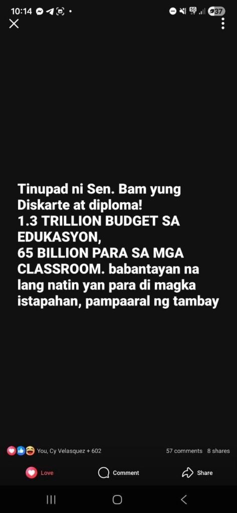 “Tinupad ni Sen. Bam yung Diskarte at diploma! 1.3 TRILLION BUDGET SA EDUKASYON, 65 BILLION PARA SA MGA CLASSROOM. babantayan na lang natin yan para di magka istapahan, pampaaral ng tambay,” Pio said on Facebook.