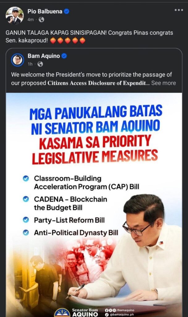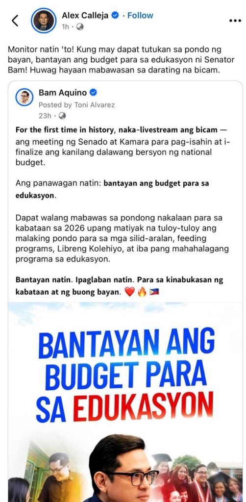 “Monitor natin ‘to. Kung may dapat tutukan sa pondo ng bayan, bantayan ang budget para sa edukasyon ni Senator Bam! Huwag hayaan mabawasan sa darating na bicam,” Alex commented, sharing a post from Senator Bam’s Facebook page highlighting his call for vigilance.