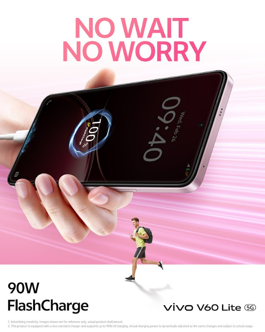 Charging is equally impressive. With 90W FlashCharge, the vivo V60 Lite powers up from 1 percent to 100 percent in only 52 minutes. A quick 10-minute charge provides enough energy for 6.6 hours of YouTube, while a 20-minute boost gives hours of uninterrupted gameplay or streaming.