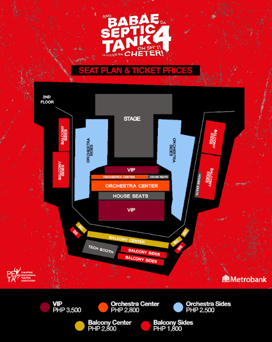 Ticket prices are P3,500 (VIP), P2,800 (Orchestra and Balcony Center), P2,500 (Orchestra Side), and P1,800 (Balcony Side).