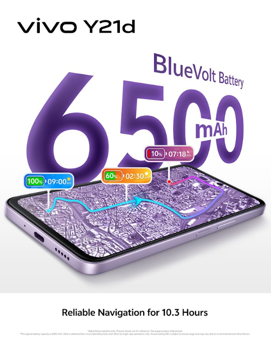 The 6,500mAh battery of the vivo Y21d is designed for longevity. In vivo laboratory tests, it retained more than 80 percent of its original capacity after 1,600 full charge cycles, which is approximately equal to five years of typical use.